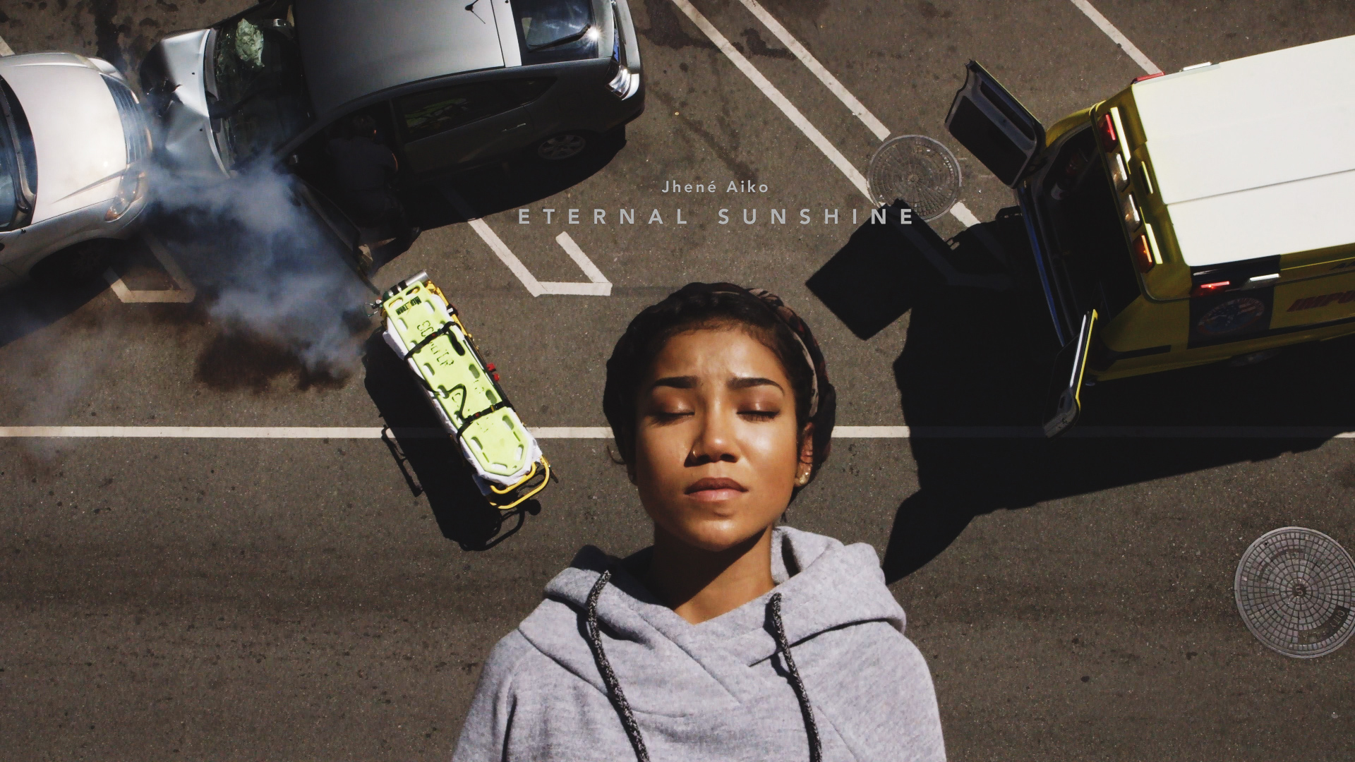 Dedicated to Jhené’s late brother, Miyagi, the goal was to design a one take shot where the backstory is explained underneath Jhené. The strategy was to have one continuous running shot of Jhené as she gets lifted into the air, revealing the accident under her, and trigger childhood memories of Jhené and her siblings. Everything in the shot is real, no green screen or VFX was used. By using a 120ft crane, we lifted Jhené while triggering the ambulance arrival near the staged car accident underneath. We achieved the shot on the 6th take.